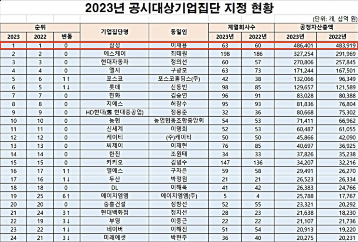 삼성의 공정자산총액은 2022년에는 483,919억 이였으며 2023년에는 486,401억으로 재계 순위 1위 자리를 지켰습니다.