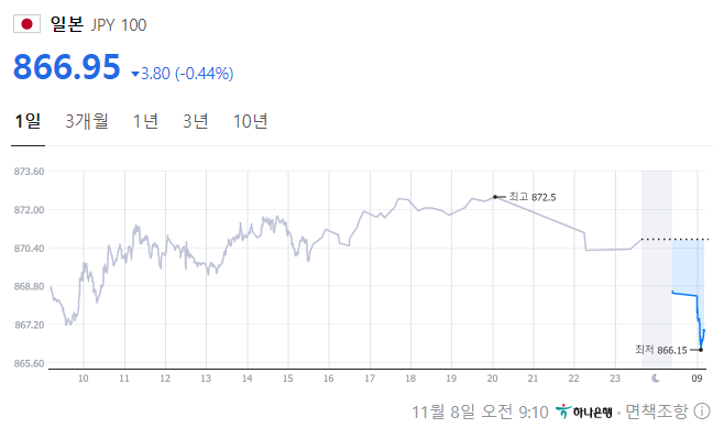 안녕하세요. 요즘 엔화의 가치가 떨어지면서 엔화를 가지고 수익을 내는 방법에 대해 많은 관심을 가지고 있는데, 저만 이런 생각하는 하는 것이 아니겠죠? 글을 쓰고 있는 11월 8일 자 현재 시점으로 검색했을 때, 오늘이 최저로 더 떨어졌더라고요. 역대급 엔저가 지속되네요. 엔화는 2015년 이후, 8년 만에 최저 수준으로 *공매도 전면 금지 등의 영향에 엔화가 상당한 약세를 보이고 있는 현재, 최고금액이었던 1191원에서 860원대까지 떨어졌는데요.