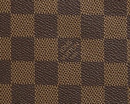 베이지색과 갈색의 바둑판 무늬에 규칙적인 간격으로 루이뷔통의 등록 상표 문구가 새겨져 있습니다.