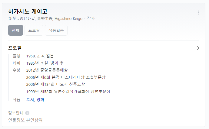 <용의자 X의 헌신>은 전 세계적으로 유명한 히가시노 게이고의 작품입니다. 2005년 미스터리 베스트에 1위로 꼽히며 많은 사랑을 받았던 이 책은 2006년 제134회 나오키상을 수상하며, 본격 미스터리 대상, 이 미스터리가 대단하다 1위를 수상하합니다. 그 후로도 더 많은 사람들에게 사랑받고 있습니다. 2008년 일본에서 영화화가 되기도 했으며 2012년에는 한국, 2017년에는 중국에서도 영화화가 됩니다. 그만큼 흥미롭고, 보는 이들을 매혹시키는 스토리를 담고 있는 것이 이 소설의 가장 큰 장점입니다. 마냥 아름답지만은 않은 러브 스토리는 인간이 한 사람을 어디까지, 어느 깊이까지 사랑할 수 있는지 독자들이 자문하게 만듭니다.