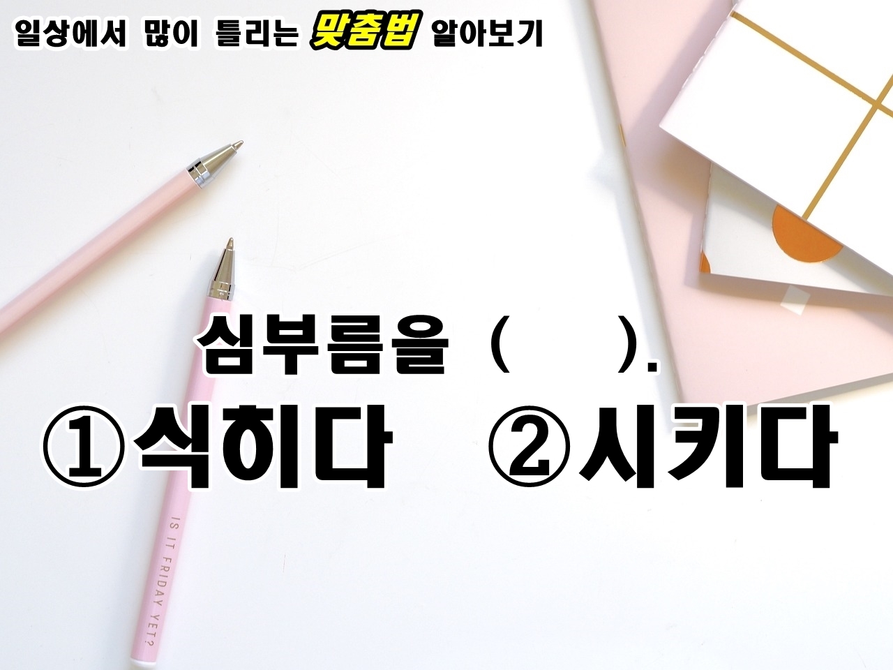 정답은 '시키다'입니다. 시키다는 '어떤 일이나 행동을 하게 하다.'와 '음식 따위를 만들어 오거나 가지고 오도록 주문하다'라는 뜻을 갖고 있습니다. 합니다. 오답으로 '식히다'는 '더운 기를 없애다.'로 '식다'의 사동사이고, '어떤 일에 대한 열의나 생각 따위를 줄이거나 가라앉히다.', '땀을 말리거나 더 흐르지 아니하게 하다.'의 의미를 갖고 있습니다.