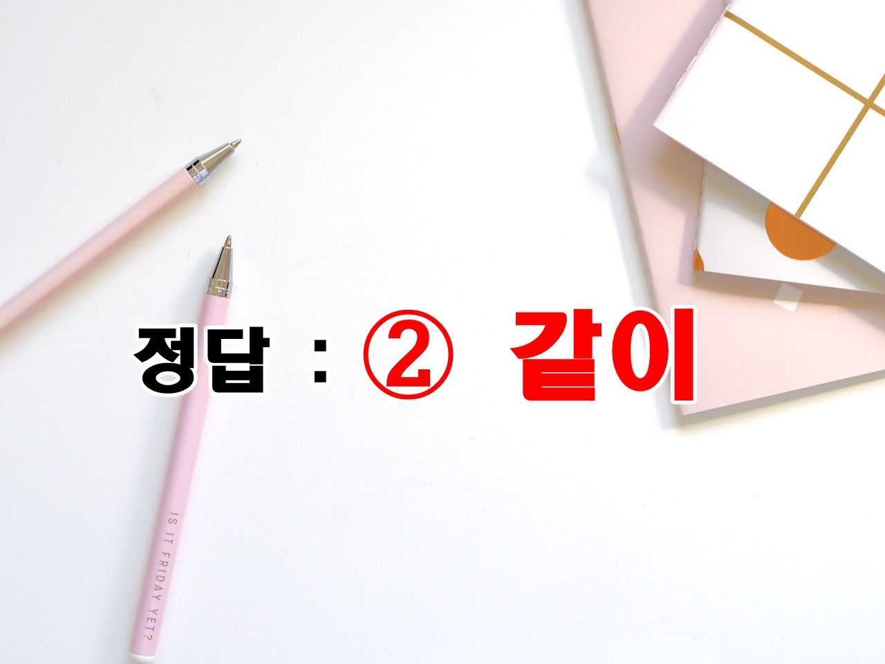 정답은 '같이'입니다. 같이의 뜻은 '둘 이상의 사람이나 사물이 함께', '어떤 상황이나 행동 따위와 다름이 없이'라는 뜻으로 부사와 '앞말이 보이는 전형적인 어떤 특징처럼'의 뜻을 나타내는 조사가 있습니다. 오답으로 '가치'는 '사물이 지니고 있는 쓸모', '대상이 인간과의 관계에 의하여 지니게 되는 중요성', '인간의 욕구나 관심의 대상 또는 목표가 되는 진, 선, 미 따위를 통틀어 이르는 말'입니다.