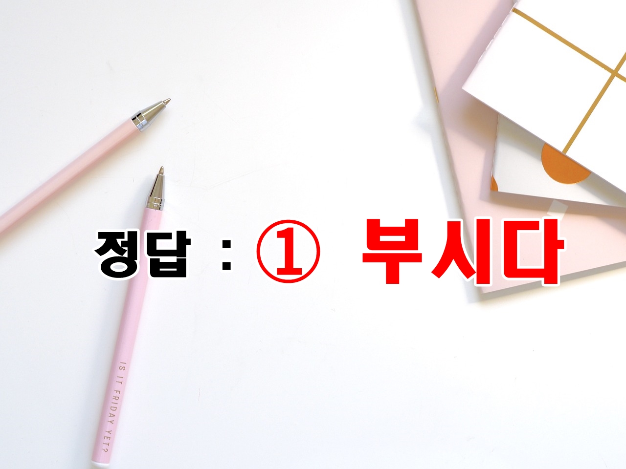 정답은 '부시다'입니다. 부시다의 뜻은 '그릇 따위를 씻어 깨끗하게 하다.', '빛이나 색채가 강렬하여 마주 보기가 어려운 상태에 있다.'라는 의미를 갖고 있고, 유의어로는 '시리다'가 있습니다. 오답으로 '부수다'는 '단단한 물체를 여러 조각이 나게 두드려 깨뜨리다.', '만들어진 물건을 두드리거나 깨뜨려 못 쓰게 만들다.'의 뜻을 가지고 있습니다. 유의어로는 '격파하다.', '깨다'가 있네요.
