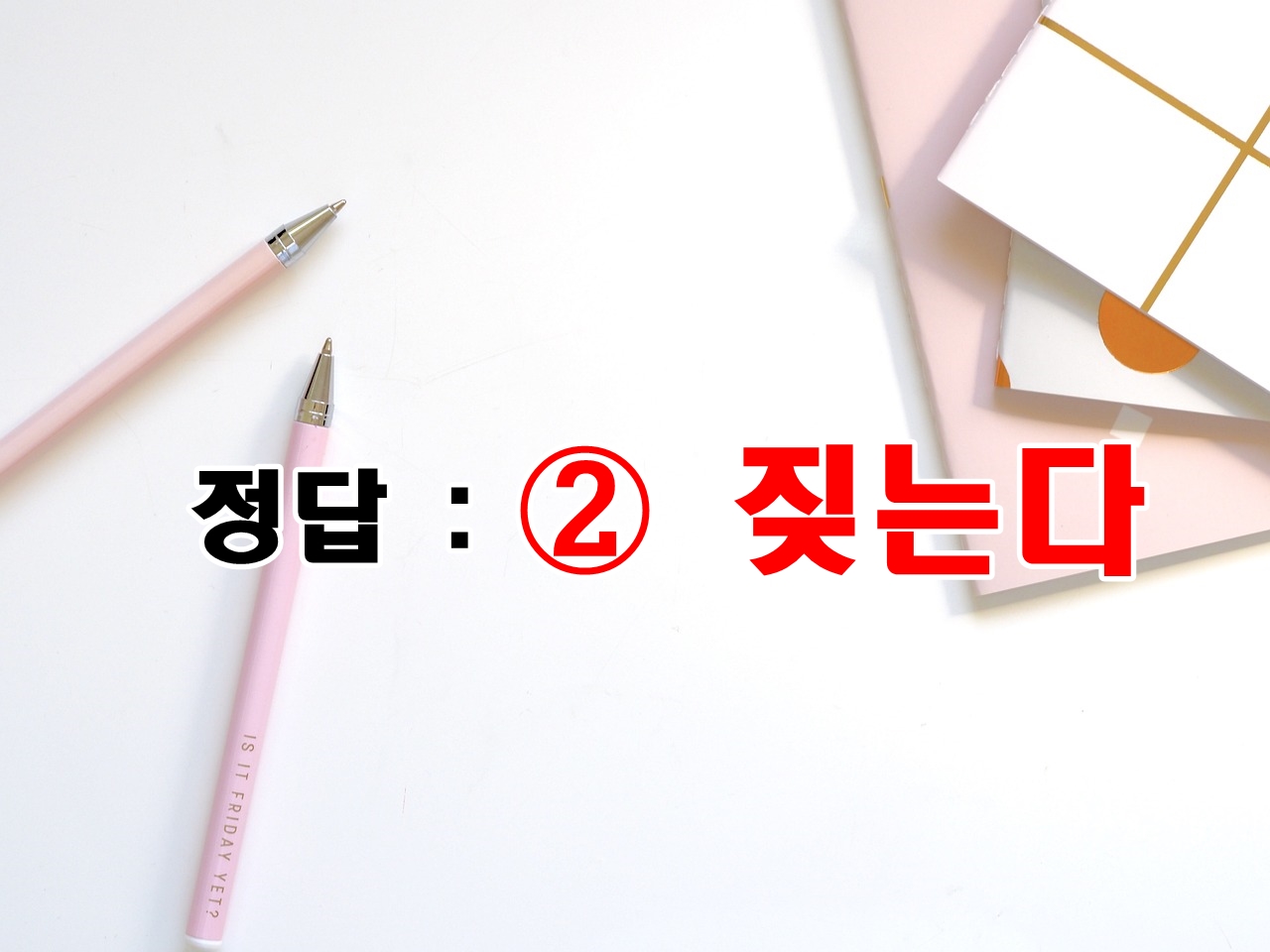정답은 '짖는다'입니다. 짖는다의 뜻은 '개가 목청으로 소리를 내다.', '까마귀나 까치가 시끄럽게 울어서 지저귀다.', '떠들썩하게 지껄이다.'라는 뜻을 갖고 있고, 오답으로 '짓는다'는 '짓다'의 활용형으로 어간 '짓-'에 종결 어미 '-는다.'가 붙어서 이루어진 말입니다. 뜻은 '재료를 들여 밥, 옷, 집 따위를 만들다.', '여러 가지 재료를 섞어 약을 만들다.', '시, 소설, 편지, 노래 가사 따위와 같은 글을 쓴다.'를 의미합니다.