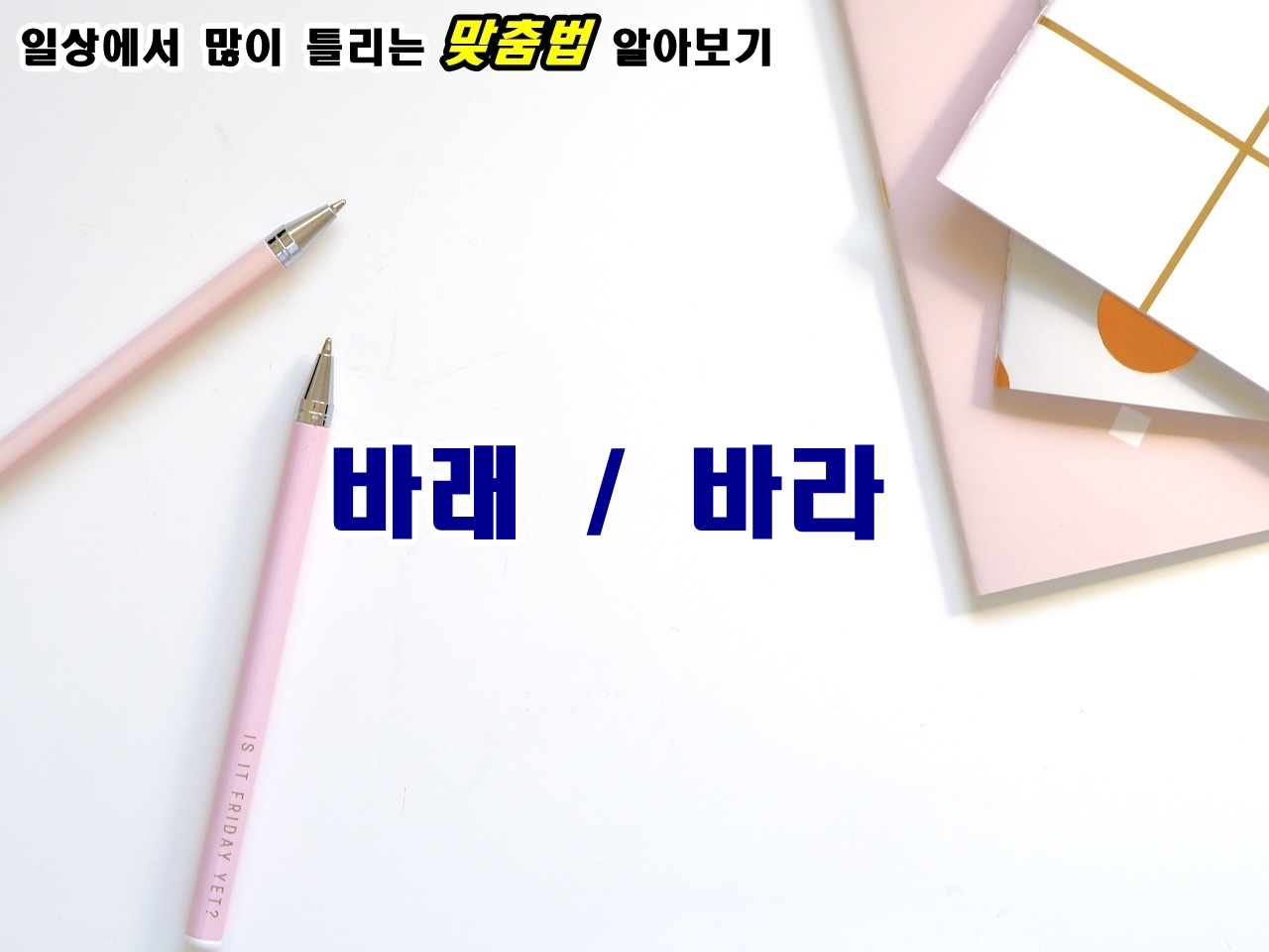 많은 분들이 잘못 사용하고 계씨는 '바래'와 '바라' 중 어느 것이 올바른 표현일까요? 정답은 '바라'입니다. '바래'도 의미가 있는 단어이지만, 둘의 의미는 전혀 다릅니다. 우리가 보통 새해 인사, 또는 덕담과 조언을 할 때 사용하는 '바라다'의 줄임말은 '바라'로 쓰입니다. '바라다'의 의미는 '생각이나 바람대로 어떤 일이나 상태가 이루어지거나 그렇게 되었으면 하고 생각하다.'라는 뜻으로 '바라다'는 어간 '바라-'뒤에 어미 '-아'가 붙을 때, '바라' 형태로 활용합니다.