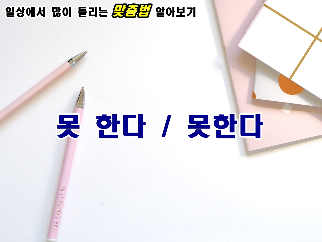 '못한다 또는 '못 한다' 중 어떻게 써야 할까요? 띄어쓰기에 따라 달라지는 의미에 대해 알아보겠습니다. 맥락에 따라 띄어쓰기가 다릅니다. '어떤 일을 일정한 수준에 못 미치게 할 경우'에는 '못한다'로 붙여 쓰고, '하다'의 부정으로 어떤 일을 하지 못하는 경우에는 '못 한다'로 써야 합니다. 예를 들어, 어떤 일을 수준에 못 미치게 할 경우는 붙여서 '그는 운동을 못한다.', '나는 노래를 못한다.', '나는 공부를 못한다.'라고 표현합니다. '하다'의 부정으로 어떤 일을 하지 못할 경우에는 띄어서 '목이 아파서 인사를 못한다.', '다리가 아파서 걷지 못 한다.' 등으로 표현됩니다.