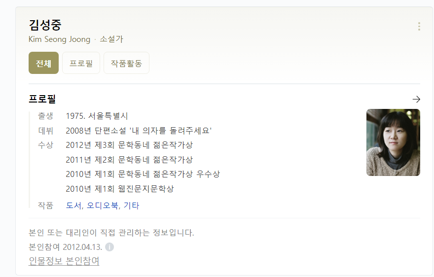 김성중 작가는 75년도 서울에서 태어나 명지대 문예창작과를 졸업했습니다. 그리고 2008년 중앙신인 문학상에 단편소설 <내 의자를 돌려주세요>로 등단하였습니다. 삶과 세계를 향한 다양한 시선으로 많은 사랑을 받아온 김성중 작가는 이번 소설에도 역시나 인간에 대한 이야기를 하고 있습니다.