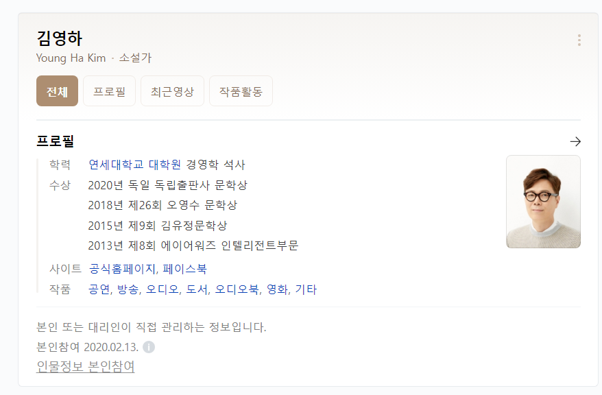김영하 작가는 1968년 강원도 화천에서 태어났습니다. 이후 연세대 경영학 학사와 석사를 취득했습니다. 한 번도 작가에 대해 생각해 본 적은 없었지만, 대학원에 재학 중 PC 통신 하이텔에 올린 짤막한 콩트들이 뜨거운 반응을 얻는 것을 확인하고 작가에 대해 고민하기 시작했다고 합니다. 이후 많은 책을 내며 문학동네작가상과 동인문학상, 황순원문학상, 만해문학상과 현대문학상, 이상문학상 등 한국의 권위 있는 대회들에서 수상하며 입지를 굳혔습니다. 그의 작품들은 현재 한국뿐 아니라 미국 프랑스 독일 일본 이탈리아 등 해외 각국에서도 사랑받고 있습니다.