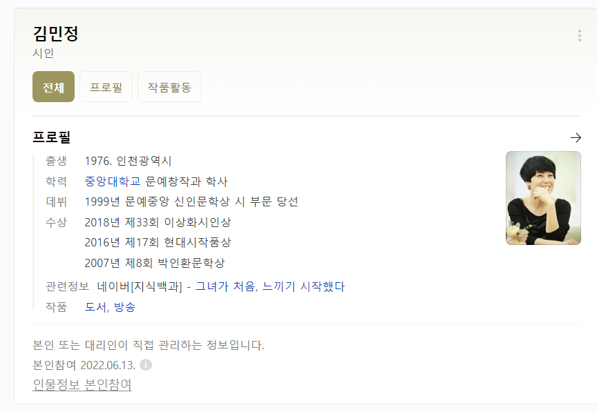 김민정 시인은 1999년 문예중앙에 신인문학상 시로 등단하였습니다. 2000년대 등장한 젊은 시인들은 2005년 이후 미래파로 불렸습니다. ‘미래파’로 일컬어지는 젊은 시인들의 시는 난해하고 독자와의 소통이 원활하게 이루어지지 않는다는 비판을 받기도 했습니다. 당시에는 김민정 시인의 파격적이고 낯선 문장과 형식에만 집중하여 작품 속 여성으로서의 주체성, 젠더 문제는 배제되어 다루어졌습니다. 지금은 미래파의 대표적 시인으로 불리며, 많은 사랑을 받고 있지요. 김민정 시인의 시는 번뜩이는 상상력과 기존 통념을 무시한 시인만의 문장으로 세계가 구축되어 있습니다.