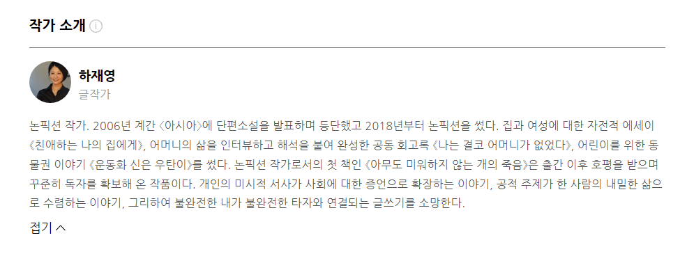 여러분은 개를 좋아하시나요? 하재영 작가의 데뷔작인 <아무도 미워하지 않는 죽음>은 버려질 뻔한 개 피피로부터 출발합니다. 피피와 함께 살면서 변화하는 일상들, 그리고 생각들을 서술해 놓은 책입니다. 피피에 대한 애정은 유기 동물을 향한 애정으로 이어집니다. 그러면서 작가는 유기 동물들의 출생에 대해 조사하고, 유기 동물들의 죽음에 대해 조사하게 됩니다. 개농장과 보호소, 또 도살장 등 많은 문제가 얽혀 있다는 것을 알게 된 작가는 근원이 되는 매듭을 풀지 않으면 이 일을 결코 해결할 수 없다는 것을 깨닫고 그 근원을 찾아가는 일을 하고자 합니다.