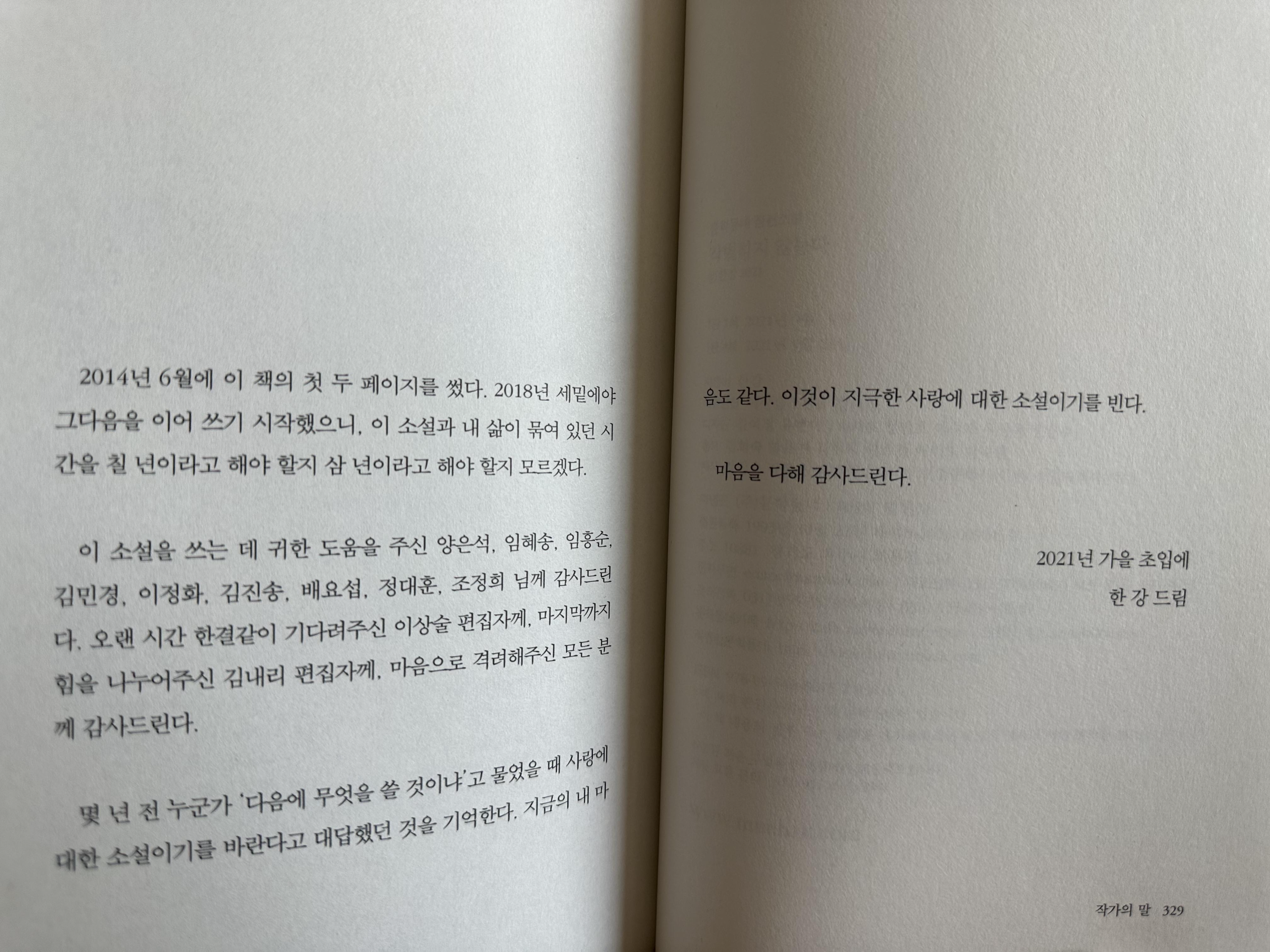 이렇듯 소설은 경하의 이야기로 풀어지지만 제주 4.3 사건을 다루고 있기도 합니다. 4.3 사건 피해자 가족들의 처참한 삶이 그려져 있지요. 일어나지 말아야 했던 우리의 역사가 정말 가슴 아프게 느껴진ㄴ 소설입니다. 한강 작가의 문장력은 우리를 금방 매혹시켜요. 비극의 시대에 서로를 포기할 수 없었던 가족들의 이야기, 우리는 책의 제목처럼 잊지 않고 이런 일들을 늘 가슴 속에 품고 살아야 할 것 같습니다. 다시는 반복되지 않기를 바라면서요.
