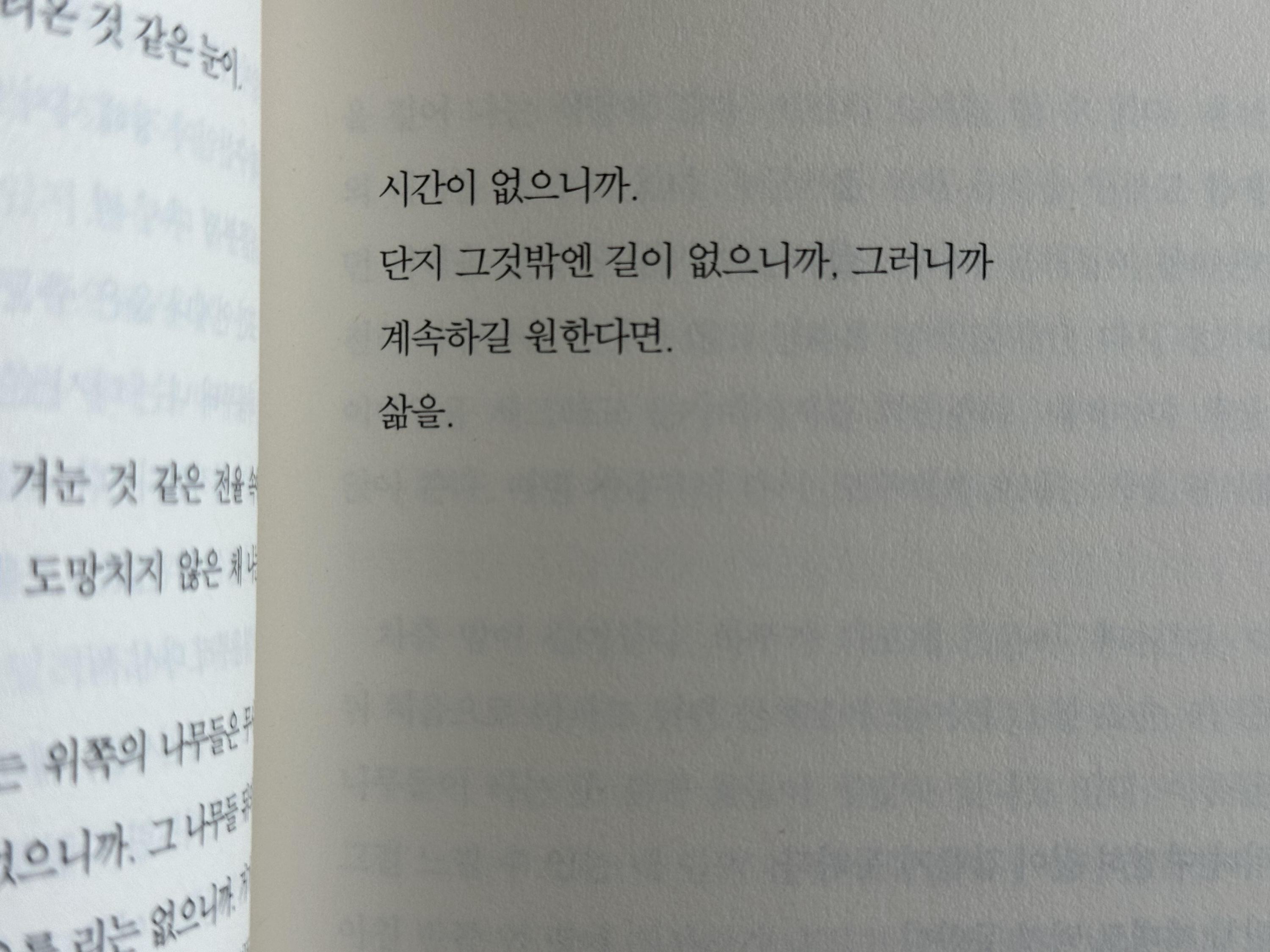 인선은 산속에 숨어서 산 아빠와 실톱을 이부자리 밑에 넣고 자면 악몽을 꾸지 않는다고 믿던 엄마를 기억합니다. 엄마는 예순이 넘어서도 삼촌의 유해라도 찾기 위해 열심히였어요. 경하가 꿨던 꿈에서 영감을 받아 인선에게 제안했던 영화는 인선이 제주에서 꼭 해야하는 일이었습니다. 나무 99그루가 넘는 곳에서 눈이 흩날리는 장면이었지요. 인선은 나무를 심은 곳을 보러 가자며 경하를 데리고 나갑니다. 그곳은 인선의 아버지가 늘 바라보던 곳이었어요. 과거와 현재가, 또 죽음을 맞이하고 누군가는 죽은 이를 찾아 헤매던 그런 곳이었습니다.